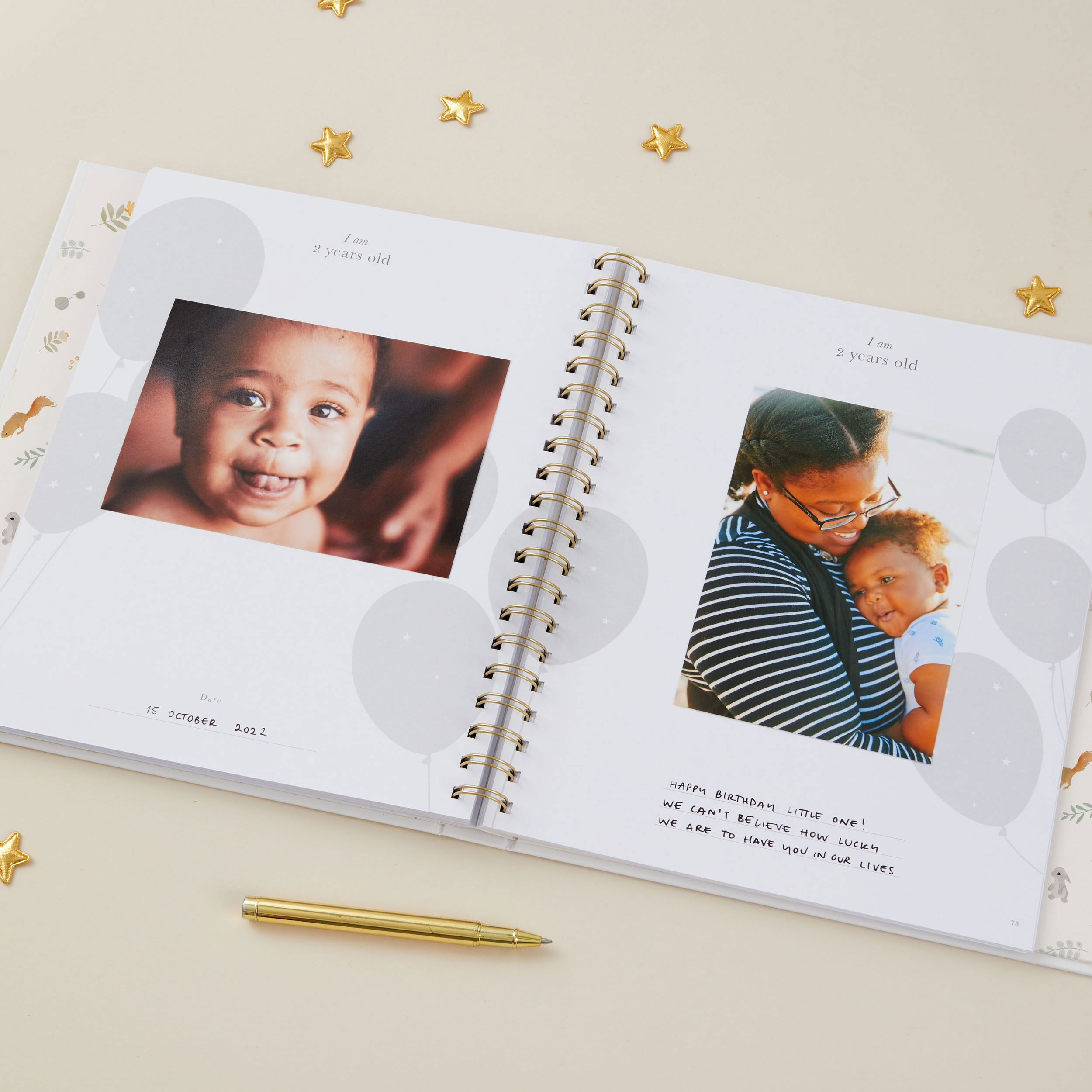 In het invulboek staan vragen voor belangrijke momenten. Er is genoeg ruimte over om je eigen inhoud toe te voegen. Het boek heeft een verborgen Wire-O-binding systeem, waardoor er meer foto’s in het boek kunnen worden toegevoegd.